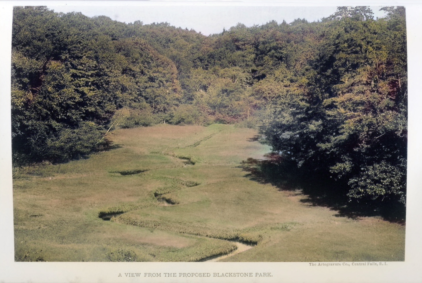 Below we see, from the same Boston collection, Blackstone Park’s grassy water-meadow. Most likely this is the “meadow” marked on one map as being roughly in the middle of the park, and located back across the road from the Boat Club house.