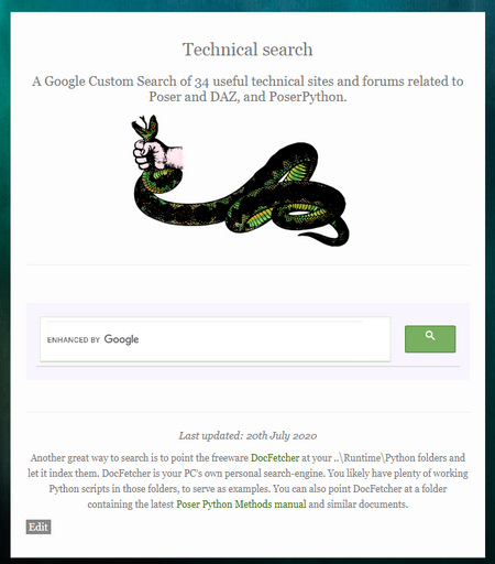 Added to my Technical Search engine, the new dedicated Krita Scripting site for Python. The Technical Search now indexes 45 useful technical pages, sites and forums likely to interest Poser and DAZ scripters and seekers of technical tips. To be used in conjunction with a local keyword search of an unpacking of the Smith Micro Forums complete and the archive of the old Runtime DNA forums.