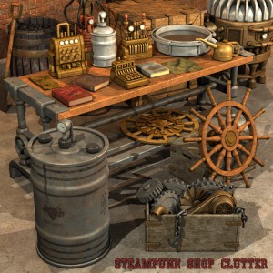 New at Renderosity, a cool set of high-quality steampunk tinkerer’s workshop clutter for DAZ Studio or Poser…