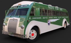A later 1930s Greyhound cross-country U.S. passenger coach.