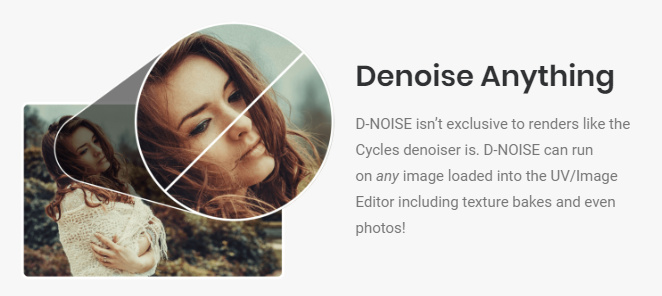 “D-NOISE can run on any image loaded into the [Blender] Image Editor including texture bakes and even photos!”