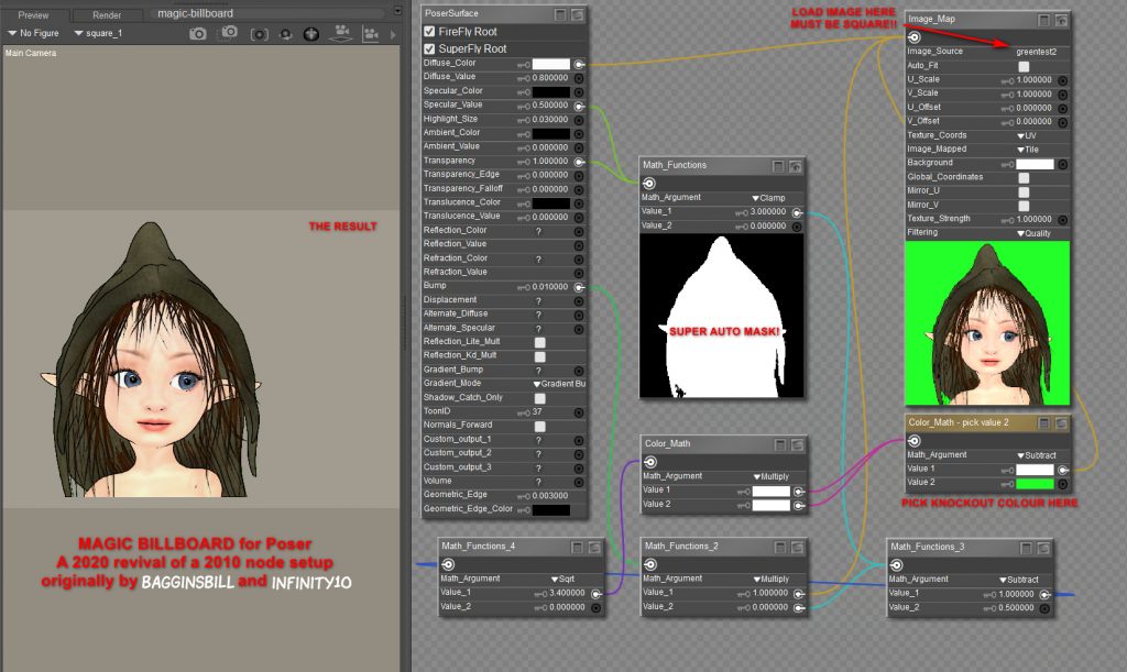 As you can see, I’ve rebuilt it and tested, and my 2020 screenshot adds guidance. It lets you drop in any square render, and with a few clicks you can mask out the background colour. Not quite as good as iClone, where you just drop a masked .PNG on the stage and it becomes a cutout billboard prop. But what follows is ‘as good as it gets’ in Poser.