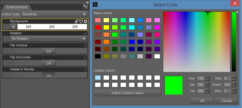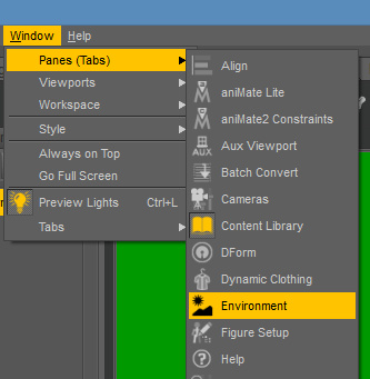 However, even that won’t do the trick. What will actually show up at the back of the render is set in the Environment Pane, found via Window | Panes (Tabs) | Environment. There you can set a solid color or a backdrop picture…