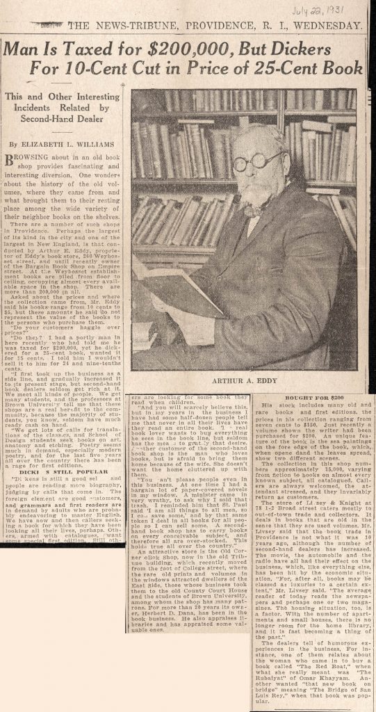 The final part of the article covers the city’s Dana bookstore, and another shop run by Livsey and Knight. This section has other detail on the state of the book trade in Providence during the early years of the Great Depression.