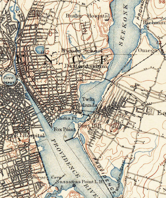 Above we also see the edge of the “meadow” area in winter flood, in the context of the Boat House and the shore road. The river Seekonk often flooded over, and thus the meadow would have been seasonally a boggy salt-meadow in its lowest section. It’s quite possible that this Boat House was the point from which the young Lovecraft set off on his solo rowing expeditions on the Seekonk. It was then a difficult and somewhat dangerous river to be out on in a small boat. Yet he became skilled enough with his boat and the river currents to land on the mud-squelching “Dagon”-like ‘Twin Islands’, so rarely shown on maps. Here is an exception.